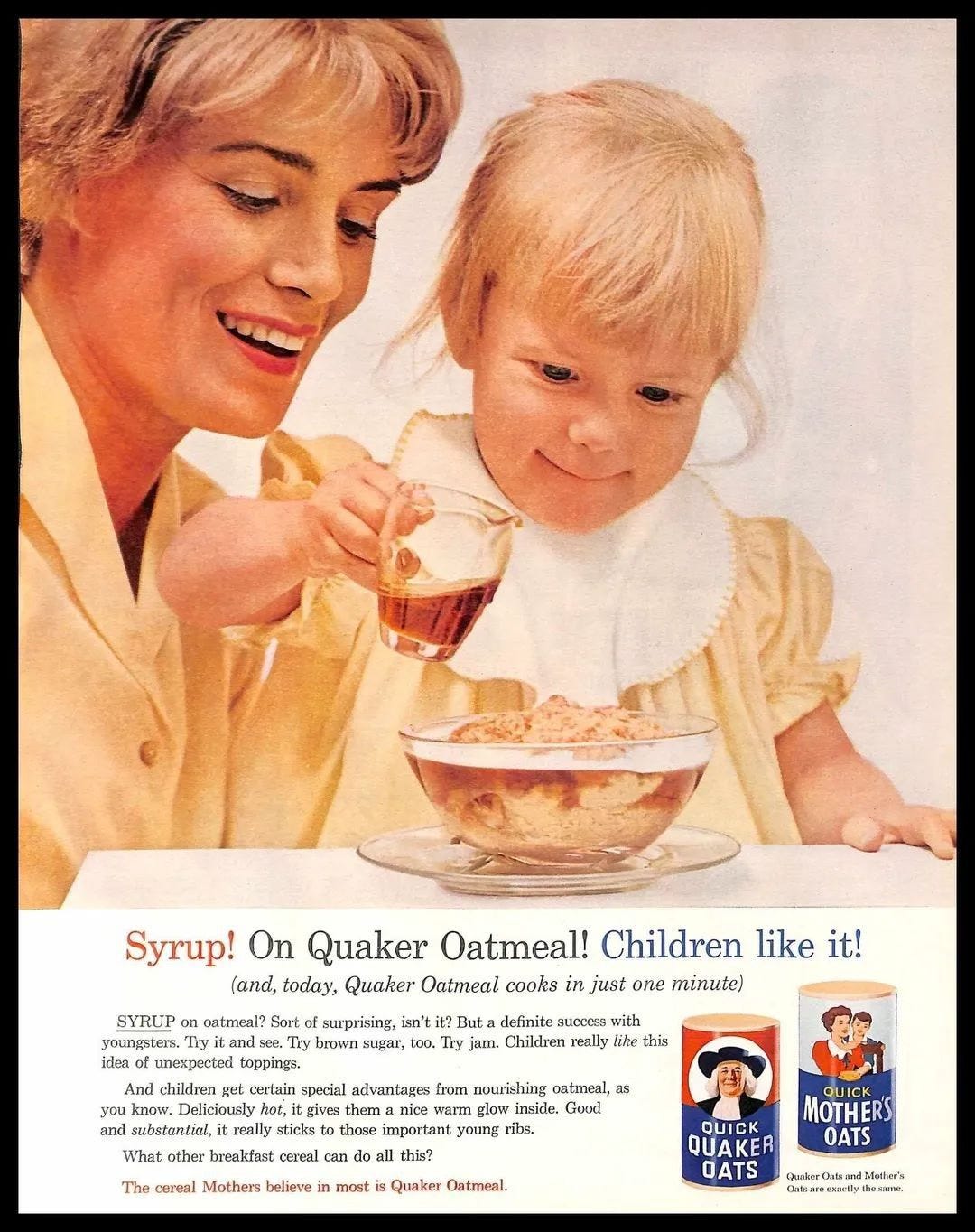 I have a theory that when advertising copy screams at you, it betrays a lack of confidence in its message. This headline, for instance, declares “Syrup! On Quaker Oatmeal! Children like it!” in the same tone you’d use when seeing someone about to heave water on a kitchen blaze, “No! It’s a grease fire! Use baking soda!”