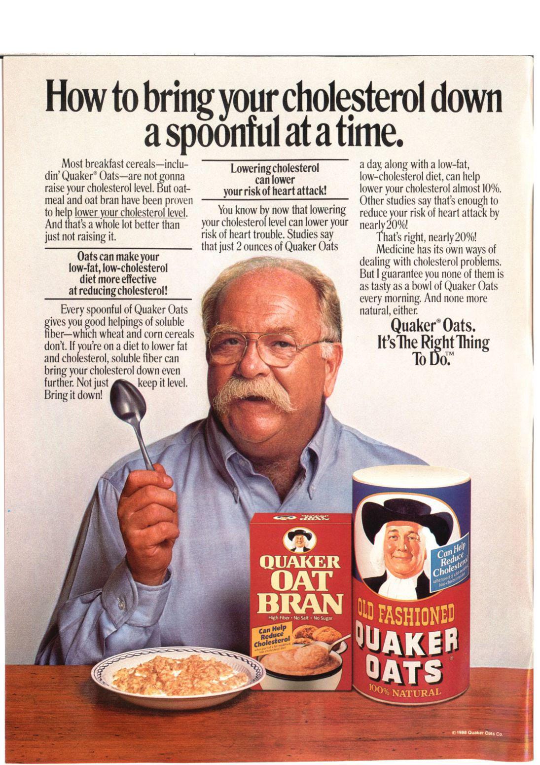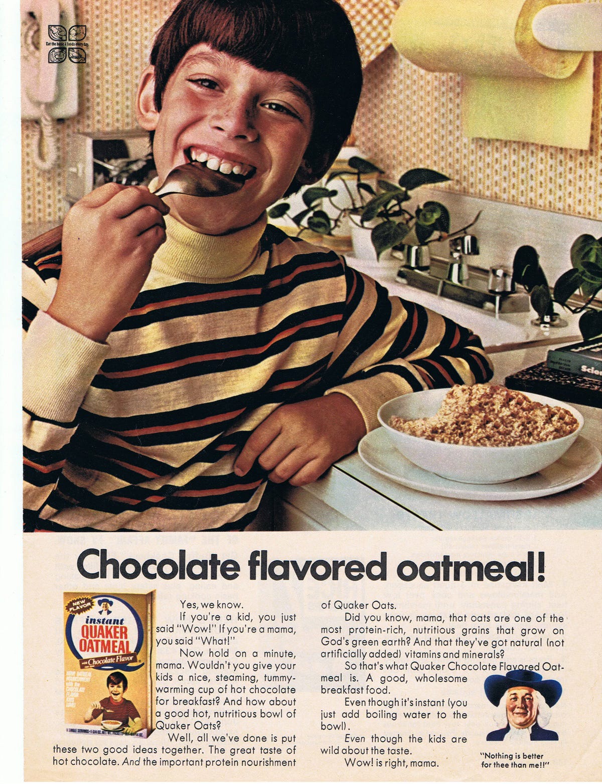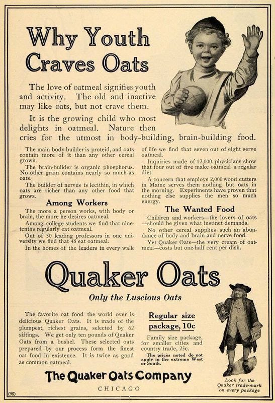 Also, this is the second time they’ve told us that Quick Quaker Oats and Quick Mother’s Oats are exactly the same, which raises the question of why they both exist. Are there oat-eaters out there who trust Quakers but not Mothers, and vice versa? Because frankly, after seeing this next ad, I’m going full Fox Mulder. I trust no one.